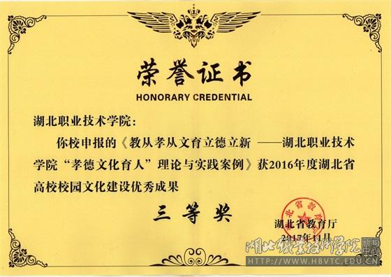 我校选送的《教从孝从文 育立德立新——虎牙手机客户端“孝德文化育人”理论与实践案例》荣获湖北省2016年度高校校园文化建设优秀成果三等奖;《建“红网” 育“网红”——虎牙手机客户端网络文化育人工作经验交流材料》入选2016年湖北省高校校园文化建设优秀成果集。