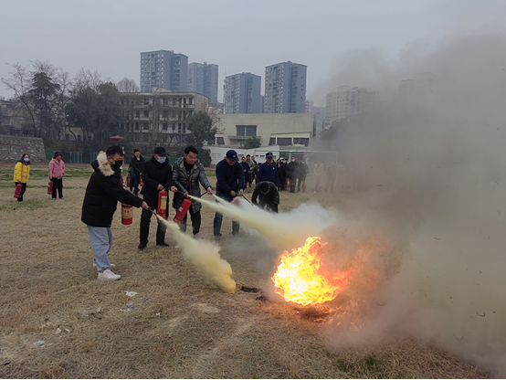 在灭火实操中,孙芳指导大家按照“提、拔、握、压”步骤来正确使用灭火器,提醒大家灭火时应站在上风或侧风位置进行灭火。在教官的指导下,每个人都进行了灭火全过程演练。