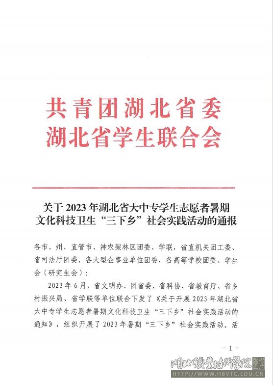 (本网讯卢雅雪)近日,共青团湖北省委、湖北省学生联合会公布了2023年湖北省大中专学生志愿者暑期文化科技卫生“三下乡”社会实践活动结果。虎牙手机客户端“同心结”社会实践队获评“优秀团队”,建筑工程学院2021级连舒畅被授予“先进个人”称号。