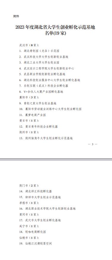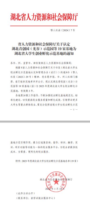 (本网讯艾欢)1月16日,湖北省人力资源和社会保障厅公布了湖北省大学生创业孵化示范基地评选结果,经学校申报、市人社局推荐、省人社厅实地核查,我校大学生创新创业基地被认定为湖北省大学生创业孵化示范基地。