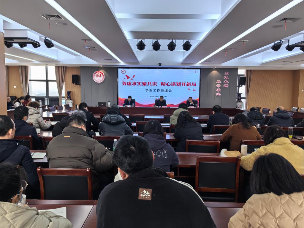 (本网讯 胡 敏 王欣怡)1月29日上午,学校2024年学生工作务虚会在图新楼601会议室召开,校长郭沙、副校长梅重出席会议并讲话。党委学工部、团委负责人和各教学院党总支书记、学生工作分管负责人及相关人员参加了会议。党委学工部负责人魏俊桃主持会议。