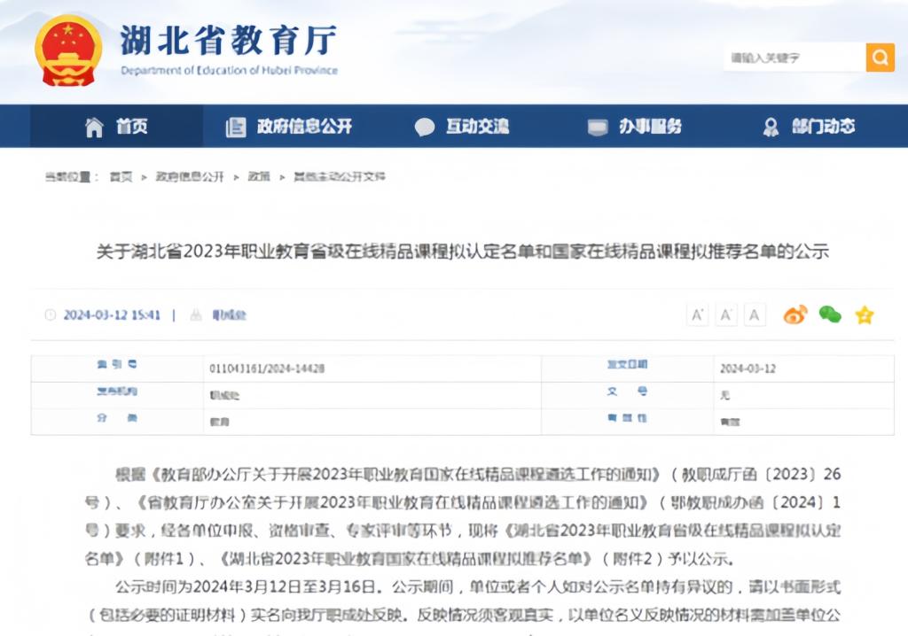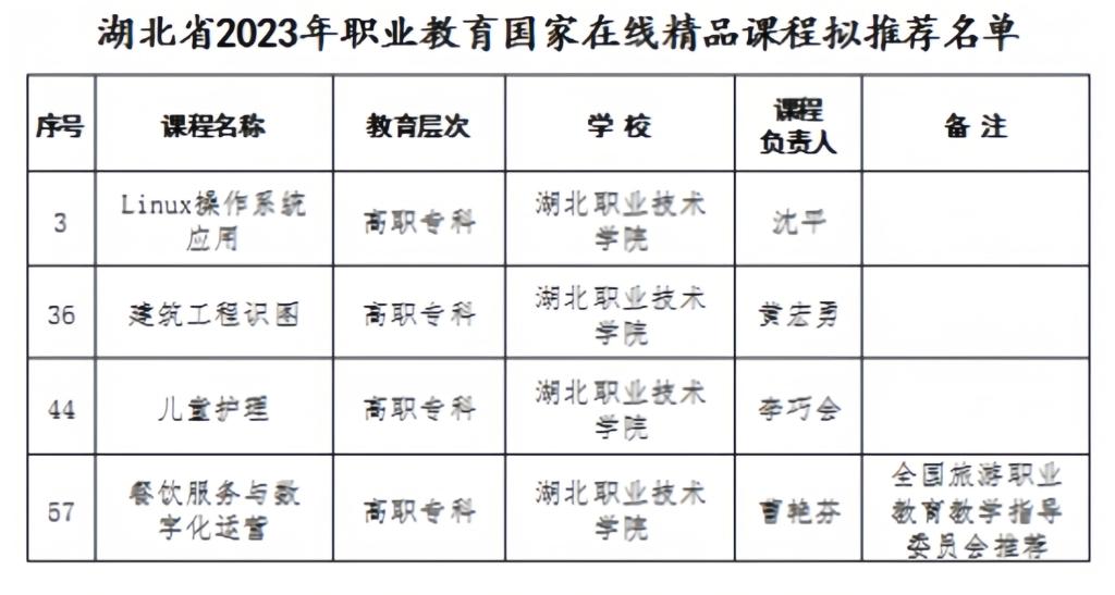 (本网讯 刘华)根据教育部和教育厅关于2023年职业教育国家在线精品课程遴选工作要求,2024年3月12日湖北省教育厅公示《湖北省2023年职业教育省级在线精品课程拟认定名单》《湖北省2023年职业教育国家在线精品课程拟推荐名单》,现公示期已满。我校Linux操作系统应用、建筑工程识图、儿童护理等9门课程获省级在线精品课程认定,Linux操作系统应用、建筑工程识图、儿童护理、餐饮服务与数字化运营4门课程获推荐参加国家在线精品课程评选。