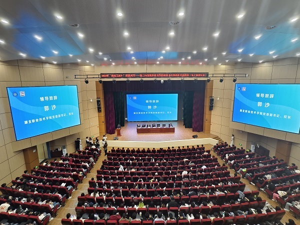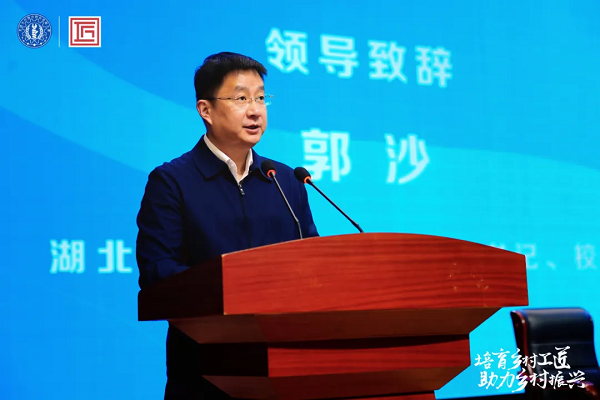党委副书记、校长郭沙致辞。郭沙指出,乡村要振兴,人才必先行。举办乡村振兴职业技能大赛,是贯彻落实习近平总书记重要指示批示和党中央决策部署的具体行动,是持续巩固拓展脱贫攻坚成果的重要举措,是弘扬劳模精神、劳动精神、工匠精神,选拔技能人才为振兴乡村赋能的生动实践。郭沙强调,一直以来,学校积极响应国家乡村振兴战略,深入推进“一村多名大学生计划”,近5年培养了3000余名新型职业农民,完成乡村振兴致富带头人、高素质农民培训2800余人。学校历年毕业生中也涌现出了一批批扎根基层、奋斗基层的先进典型,为乡村振兴注入了蓬勃人才动能。本次大赛,我们定将全力以赴、不辱使命,精心组织、周到服务,用心擦亮湖北省职业院校技能大赛品牌。同时学校也将以办好这次大赛为契机,乘势而上、奋发进取,激发创新之志,永葆工匠之心,秉持开放之策,进一步发挥好赛事的引领带动作用,大力培育高素质技术技能人才,推动学校高质量、高水平、高速度发展,为助推职业教育改革发展贡献“湖职”力量;以技能之我,展工匠之姿,携起手来,创优争先,匠心筑梦,团结奋进,永攀高峰,共同谱写职业院校高质量发展的新篇章!