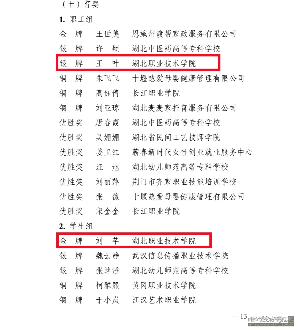 我校获得“两金”“两银”的好成绩。其中,教育与艺术学院学生组刘芊获“育婴员”项目全省金奖,王叶老师获得职工组银奖;财经与旅游学院职工组毛婷老师获得“电子商务”项目金奖,学生组刘书成获得银奖。财经与旅游学院毛婷老师、教育与艺术学院学生刘芊将代表湖北队参加全国大赛。经学校推荐、专家审核,确定肖成林、宗敏、肖敏晨、张玉洁、黄宏勇等5名同志为项目裁判。