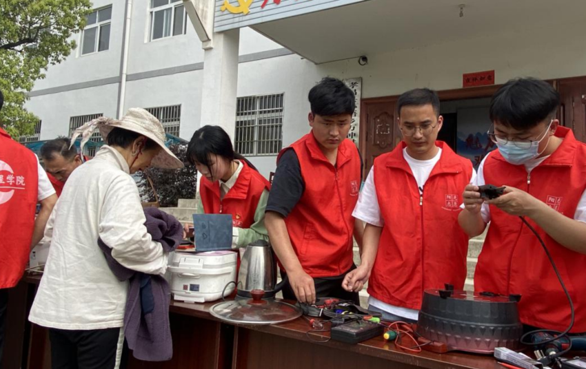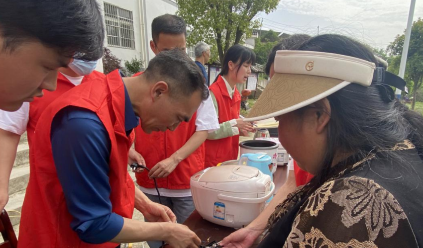家电维修服务现场,机电工程学院“本禹”志愿服务队志愿者们,小心翼翼地拆开各种家电电器,认真查找故障原因,成功地让一件件小家电正常运转。同时还耐心地向现场群众讲解家电使用、保养及注意事项,对无法修好的电器认真地说明原因,并提供维修建议。