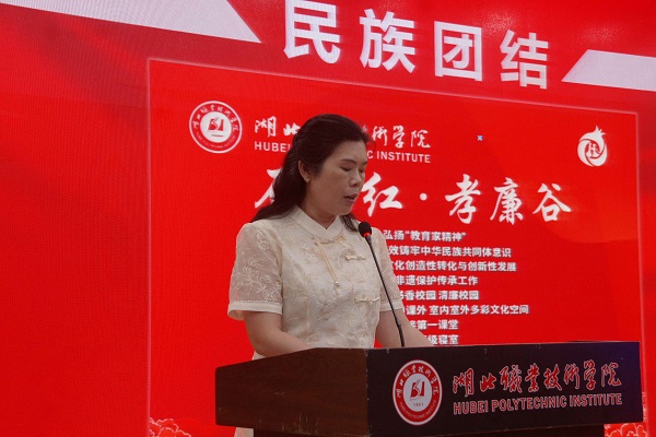 湖北省三八红旗手、孝感市第十二届“十大孝子”、孝感市第七届“道德模范”、学校石榴红·孝廉谷文化基地指导老师余丽,以孝育人,以文化人,搭建文化平台,开展文化素质教育,弘扬中华孝文化,扎实推进铸牢中华民族共同体意识教育,促进各族学子交往交流交融,服务各族学子成人成才、创新创业,将民族团结的“种子”播撒在广大青年学子心中,共建精神家园,开启美好未来。