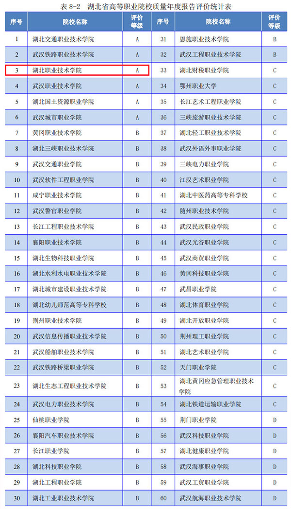 (本网讯 龚洪浪 代灯华)在湖北省教育厅刚刚发布的《湖北省高等职业教育质量年度报告(2023)》中,我校报送的质量年度报告被评为A等。据悉,2023年,湖北省60所高等职业院校报送并发布了学校质量年度报告,省教育厅组织专家对其进行了内容审核、数据复核、合规性等综合评价,根据打分结果,按照10%、40%、40%、10%的比例划分了A、B、C、D四个评价等级。
