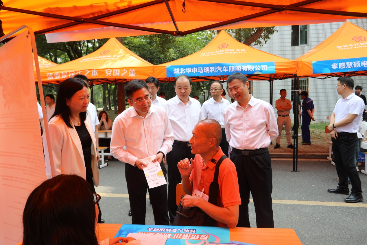 (本网讯 艾欢)6月6日,“孝感市爱心助残就业创业企业联盟”成立暨“爱铸澴川·职等你来”残疾人专场招聘活动启动仪式在我校举行。省残联党组成员、副理事长毛建东,市政府副市长、市残工委主任石必成,市政协副主席、市工商联主席陈鸿杰,学校党委书记郭国文,市政府副秘书长蔡国平,市残联党组书记、理事长朱丽玲等出席活动,并为联盟首批成员单位、副主席单位和主席单位授牌。