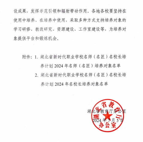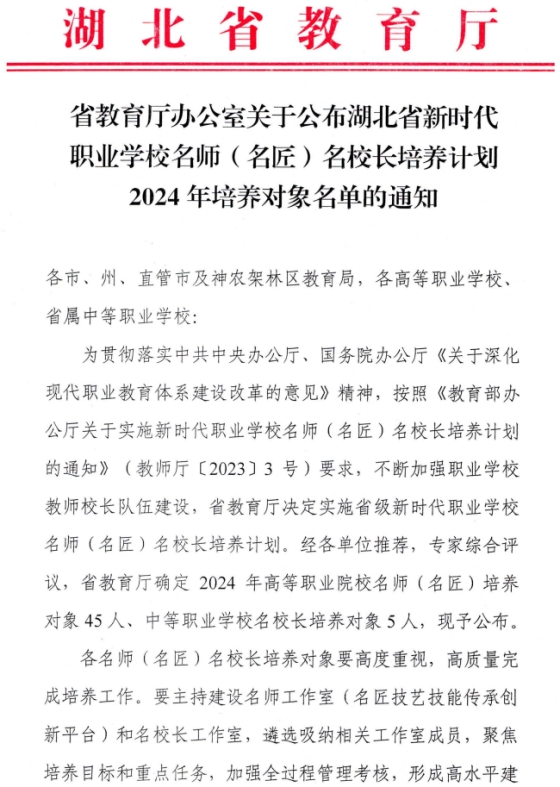 (本网讯 张舟)近日,省教育厅办公室公布了湖北省新时代职业学校名师(名匠)名校长培养计划培养对象名单,张玉洁入选名师培养对象,朱志强入选名匠培养对象。