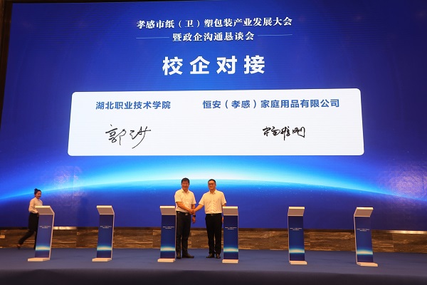 (本网讯陈灏 王光耀)9月10日,孝感市纸(卫)塑包装产业发展大会暨政企沟通恳谈会在孝感召开。市领导及市区相关单位负责人参加会议,全国纸(卫)塑包装产业商(协)会嘉宾,行业知名专家学者、纸(卫)塑包装行业龙头企业、有意向投资企业代表、孝感市纸(卫)塑包装产业链企业代表参加活动。我校校长郭沙出席会议,并与恒安集团签订《校企合作框架协议》。