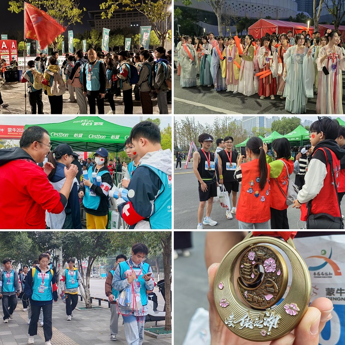 2024孝感马拉松共设有马拉松(42.195公里)、半程马拉松(21.0975公里)、孝爱欢乐跑(约6公里)3个项目。全程马拉松取道沿河南路,经过我校南校区。全校两万多名师生、教职员工,或通过线上直播收看比赛盛况,隔着屏幕送上祝福为跑友们鼓劲、“打CALL”;或在赛道两边,热情洋溢的为选手加油助威。