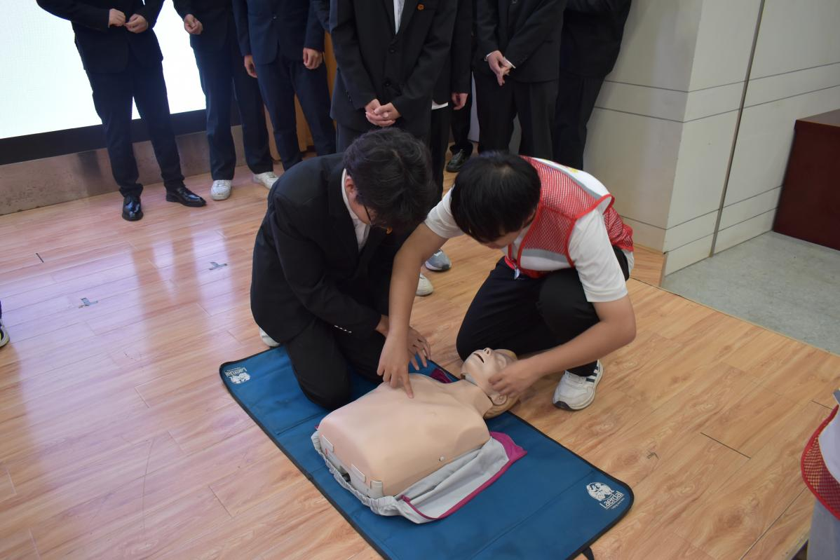 我校护理学院团总支书记、“护” 你平安应急救护志愿服务队负责人唐凌霎老师,以日常生活中常见的突发状况为切入点,重点围绕气道异物梗阻、心肺复苏(CPR)、创伤救护等急救措施的核心原理展开讲解。为增强教学的直观性,唐老师带领志愿服务队队员进行分步骤、全流程的规范演示—— 从判断患者意识状态、评估现场环境安全,到实施胸外按压、人工呼吸及 AED(自动体外除颤器)操作,每一个关键环节都讲解得细致入微,将抽象的急救知识转化为清晰易懂的实操指南。