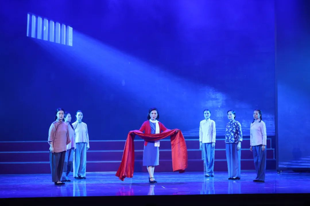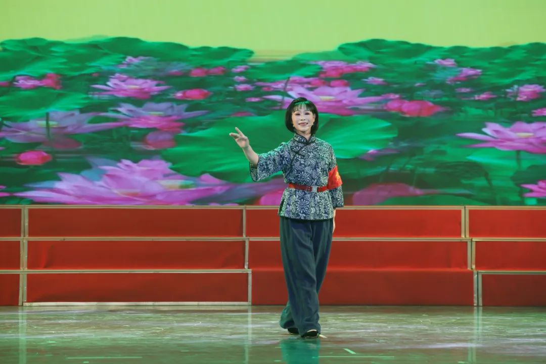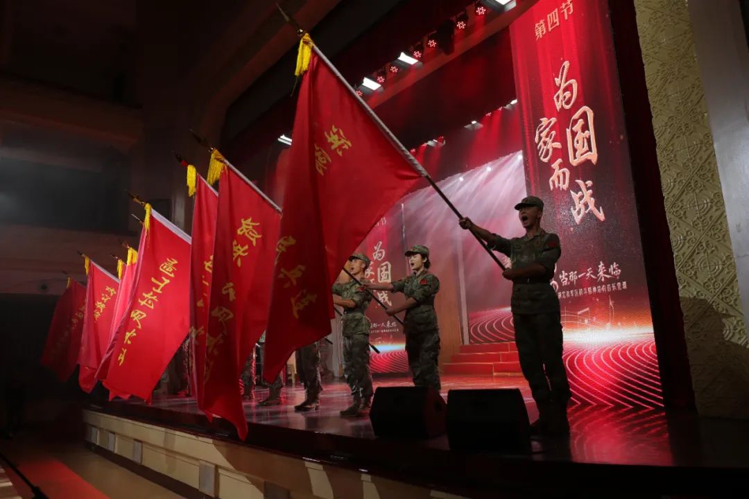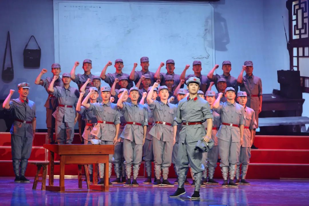 舞台上光影变幻,《洪湖赤卫队》经典场景重现。“洪湖赤卫队民兵连”、“贺英女子民兵连”、“民兵南水北调守井连”等10面旗帜在旗手护卫下依次入场,旗手们步伐铿锵,呐喊声响彻会场,与历史影像中的枪炮声形成奇妙呼应。