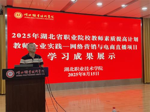 (本网讯 肖敏晨 毛婷 马江浩 王峰 李蓓蕾 李媛 汪行光 宋巍)8月15日,湖北省2025年职业院校教师素质提高计划教师企业实践——网络营销与电商直播项目学习成果展示暨结业式在西区文博馆学术报告厅举行,校党委委员、副校长杨立明出席并讲话,授课专家代表黄享苟、我校继续教育学院院长丁浙英、财经与旅游学院党总支书记徐斌华等以及60名参训学员共同见证活动。活动由财经与旅游学院院长曹艳芬主持。
