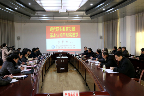 1月13日,孝感市职业教育发展研究中心学术年会暨校际合作交流推进会在我校举行。会议期间,湖北工业大学职业技术师范学院院长、高等职业教育研究中心主任李梦卿教授应邀来校作了题为《现代职业教育发展:基本认知与现实要求》的学术报告。参加本次学术年会暨校际合作交流推进会的全体代表及学校各二级教学院负责人等聆听了报告。报告会会由孝感市职业教育发展研究中心主任、学校工会主席闵建杰主持。