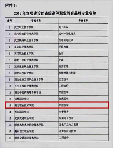 根据省教育厅《关于组织开展高等职业教育省级品牌专业与特色专业建设的通知》(鄂教职成〔2014〕8号)和省教育厅《关于印发< 湖北省高等职业教育品牌和特色专业建设项目管理办法>的通知》(鄂教职成〔2015〕9号)要求,医学院高度重视口腔医学省级品牌专业的申报立项工作,组织口腔医学专业负责人及全体教师认真学习有关文件精神,总结专业建设的优势和特色,制定了口腔医学专业品牌的建设方案和建设目标。经省教育厅组织专家评审审核,同意学校口腔医学专业为2016年省级高等职业教育品牌立项建设专业。