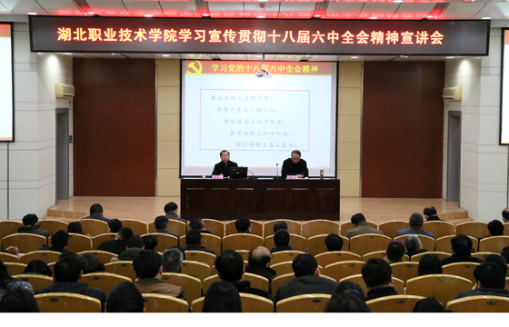 为了深入学习宣传贯彻党的十八届六中全会精神,根据湖北省委高校工委、孝感市机关工委统一安排,12月7日下午,孝感市委宣讲团成员、湖北工程学院马克思主义学院院长、教授李新安来校作宣讲报告。党委书记蔡诗红主持报告会。全体在校领导、全体中层干部、离退休党员干部代表、各党总支下设基层党支部全体支委等200多人一起聆听了报告会。