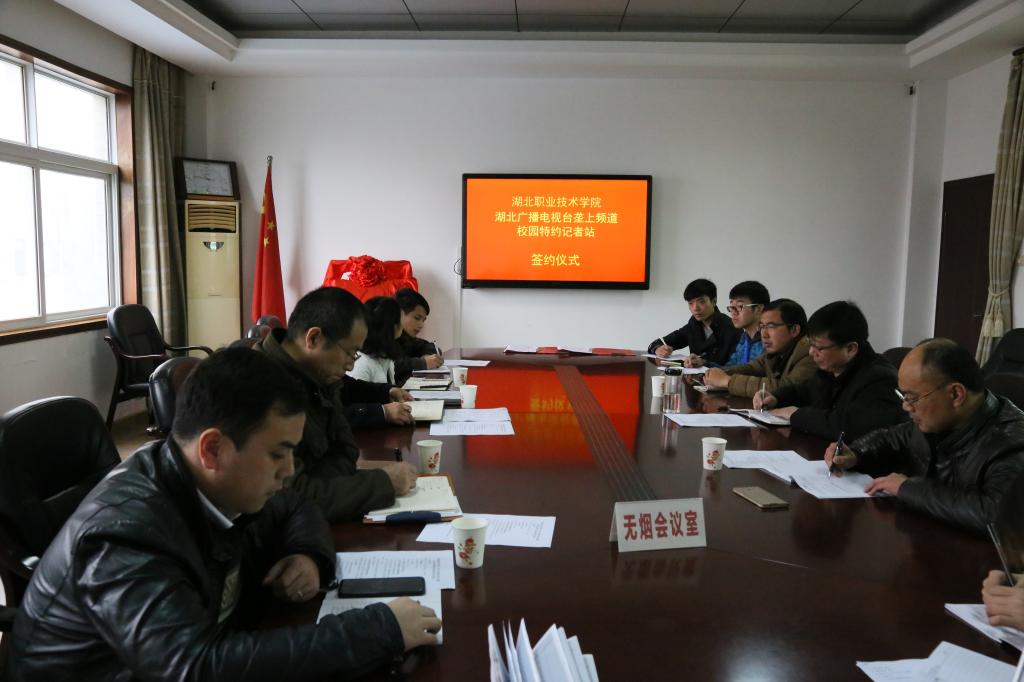 12月21日上午,湖北广播电视台垄上频道驻虎牙手机客户端特约记者站揭牌仪式在行政楼301会议室举行。湖北长江垄上传媒集团总经理丁小平、垄上频道融媒体信息中心主任王玉珩、《打工服务社》总制片人湖北垄上人力总经理胡安龙、《打工服务社》执行制片人湖北垄上人力运营总监刘友智,学校党委副书记张勇、党委宣传部负责人曾少武、教师代表王非、校园特约记者代表等出席仪式。揭牌仪式由曾少武主持。