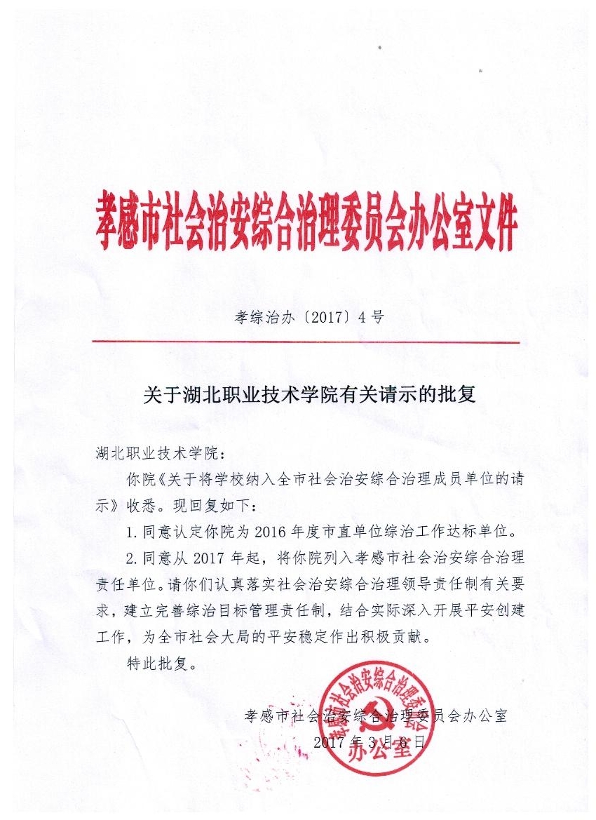 根据孝综治办[2017]4号文件精神,学校被认定为2016年度孝感市市直单位综合治理工作达标单位。