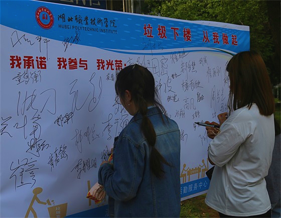 活动现场,同学们积极响应、踊跃参与,学生宿舍管理委员会成员热情地介绍本次活动的内容及意义,同学们开心地在倡议书旁的宣传栏“我承诺、我参与、我光荣”下郑重的签名,并大声宣读“垃圾下楼,从我做起”“我为文明代言”等口号。