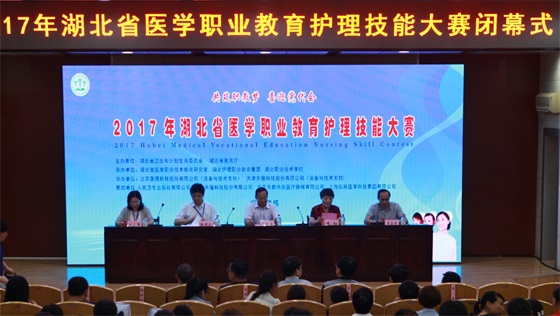 6月11日下午,由我校承办的2017年湖北省医学职业教育护理技能大赛顺利落下帷幕。大赛闭幕式在学校文博馆学术报告厅举行,省卫计委巡视员黄运虎、省卫计委科教处调研员张有元、省护理学会副会长武汉大学中南医院护理部主任朱小平、学校校长朱虹等出席了闭幕式,并为各获奖选手颁奖。来自省内的27所参赛院校34支代表队的师生代表们参加了闭幕式,闭幕式由省医学职业教育研究室主任周森林主持。