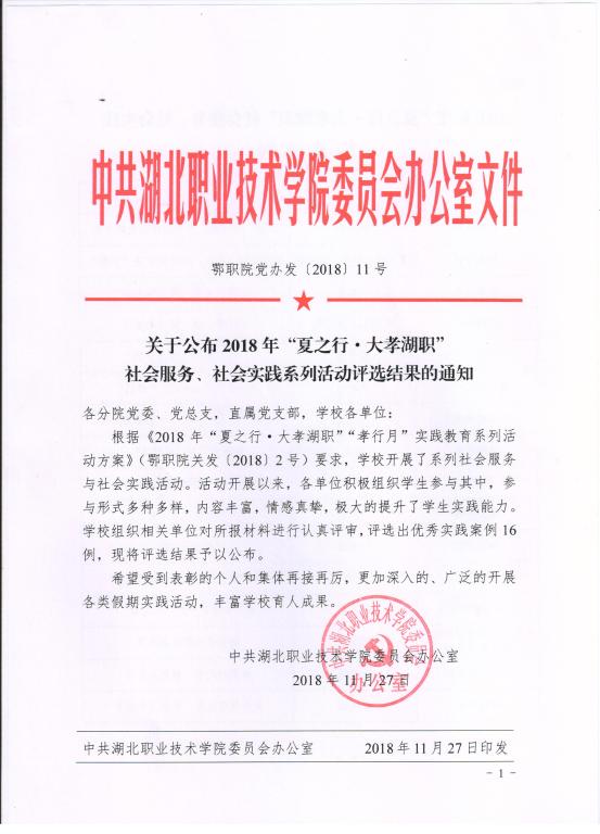 关于公布2018年“夏之行•大孝湖职” 社会服务、社会实践系列活动评选结果的通知