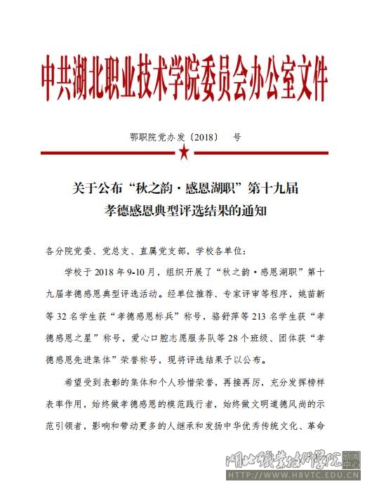 关于公布“秋之韵·感恩湖职”第十九届孝德感恩典型评选结果的通知