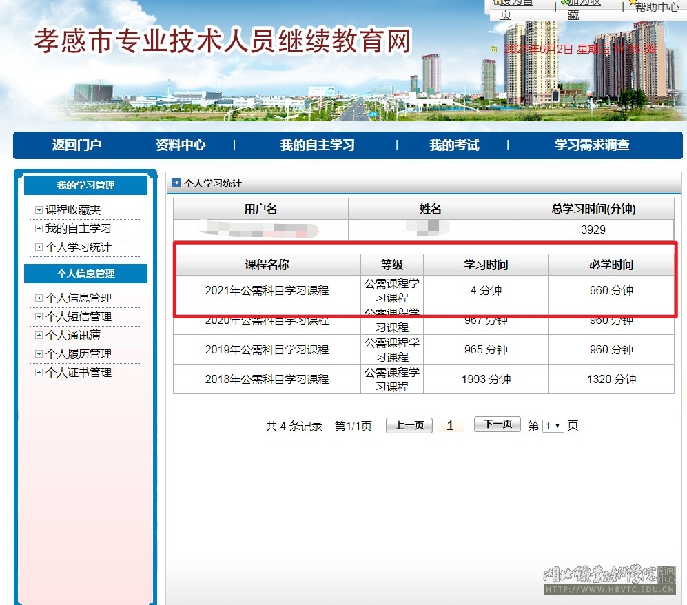 在“个人中心信息管理”中,点击“个人学习统计”,即可查询已学学时。