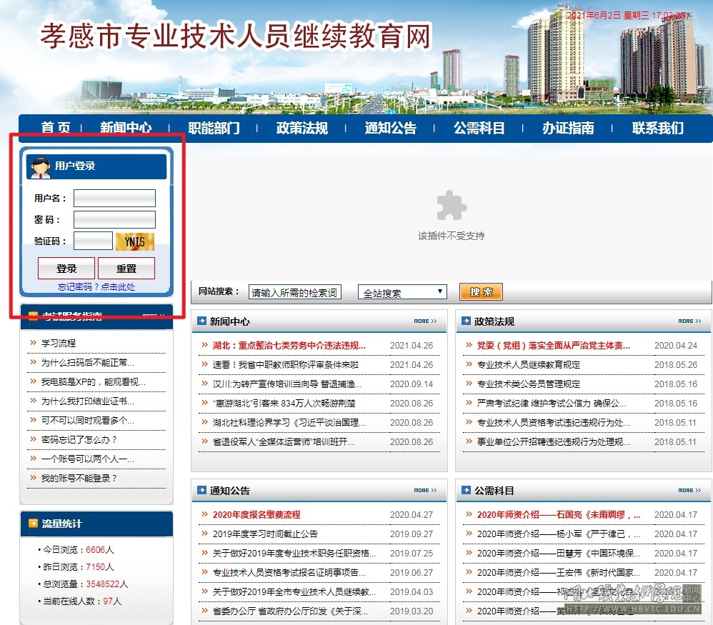 学员进入继续教育网首页后,在用户模块登录,用户名为个人身份证号码,登录密码为:123456,验证码看不清可点击图片刷新。