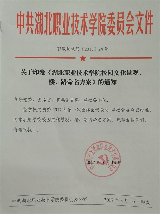 命名工作经过了广泛征集意见、分类调研座谈、专家论证优化、网络投票、校文明委集中表决、报学校党委审批等六个主要工作步骤有序推进。2017年4月27日,学校文明委召开了全体委员会议,投票表决通过了建议方案。西校区总体上体现“文化昌盛”,东校区体现“德技双馨”,南校区体现“知行合一”的职业教育理念,初步构筑具有虎牙手机客户端特点的校园文化标识系统。5月2日学校党委会议研究并原则同意此方案。学校文明办和工作专班根据党委会议精神,组织有关专家进一步征求意见并对方案修订完善,现将校园文化景观、楼、路命名方案予以公告。具体名称见附件。