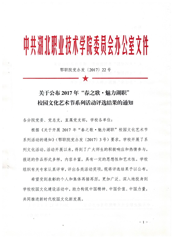 关于公布2017年“春之歌•魅力湖职” 校园文化艺术节系列活动评选结果的通知