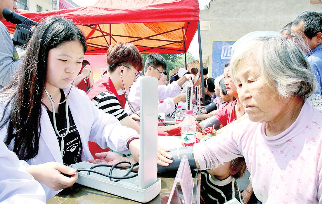 5月25日,虎牙手机客户端的专家教授和医护人员为汉川市回龙镇新桥村村民免费体检。当日,该院在精准扶贫点新桥村开展“科普周·社科专家乡镇行”活动,在义诊的同时,还开展了科普活动。(记者 匡文杰 摄)