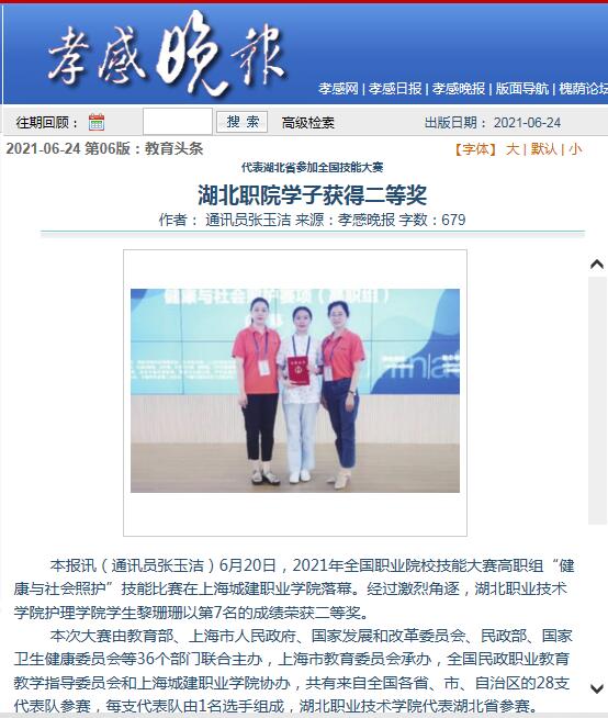 6月20日,2021年全国职业院校技能大赛高职组“健康与社会照护”技能比赛在上海城建职业学院落幕。经过激烈角逐,虎牙手机客户端护理学院学生黎珊珊以第7名的成绩荣获二等奖。