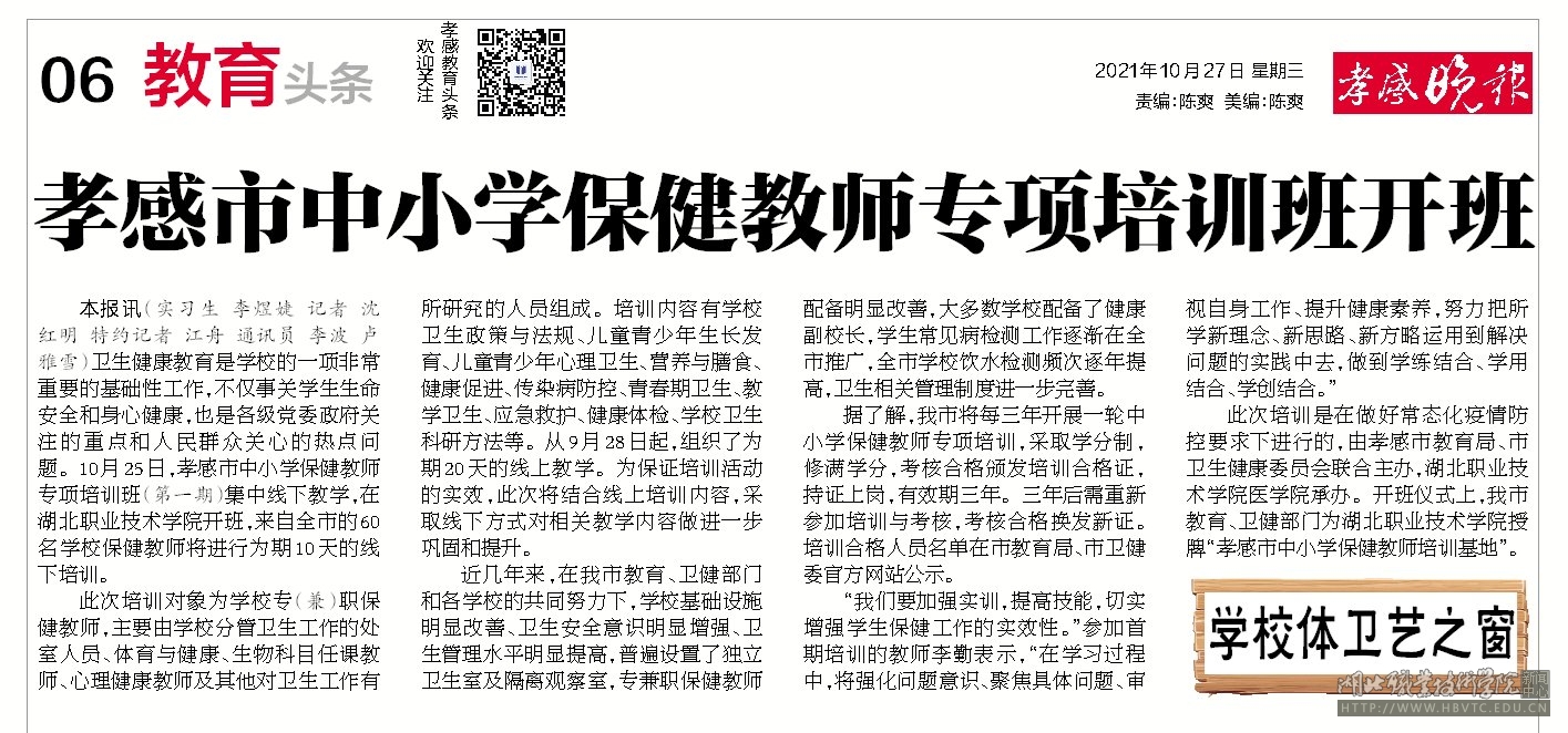 本报讯(实习生 李煜婕 记者 沈红明 特约记者 江舟 通讯员 李波 卢雅雪)卫生健康教育是学校的一项非常重要的基础性工作,不仅事关学生生命安全和身心健康,也是各级党委政府关注的重点和人民群众关心的热点问题。10月25日,孝感市中小学保健教师专项培训班(第一期)集中线下教学,在虎牙手机客户端开班,来自全市的60名学校保健教师将进行为期 10 天的线下培训。