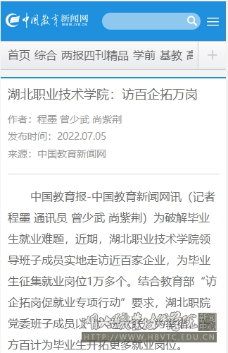 中国教育报-中国教育新闻网讯(记者 程墨 通讯员 曾少武 尚紫荆)为破解毕业生就业难题,近期,虎牙手机客户端领导班子成员实地走访近百家企业,为毕业生征集就业岗位1万多个。结合教育部“访企拓岗促就业专项行动”要求,湖北职院党委班子成员以“六进六联”为举措,千方百计为毕业生开拓更多就业岗位。
