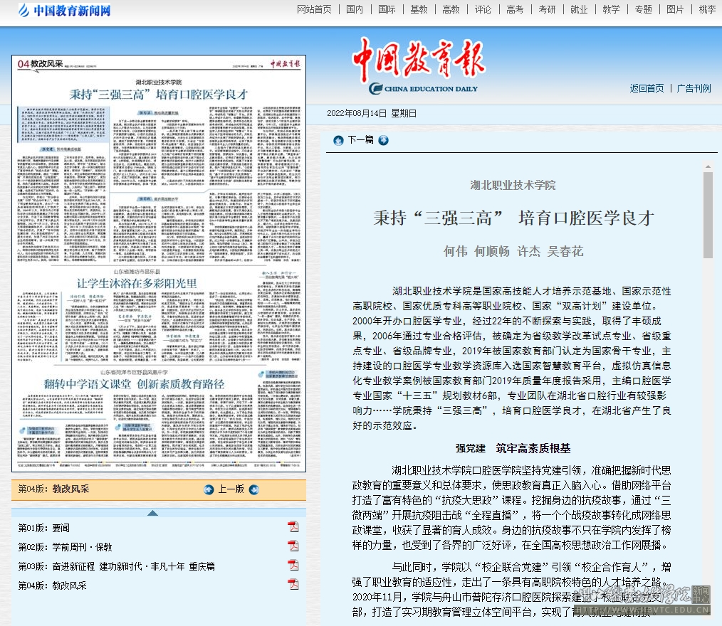 虎牙手机客户端是国家高技能人才培养示范基地、国家示范性高职院校、国家优质专科高等职业院校、国家“双高计划”建设单位。2000年开办口腔医学专业,经过22年的不断探索与实践,取得了丰硕成果,2006年通过专业合格评估,被确定为省级教学改革试点专业、省级重点专业、省级品牌专业,2019年被国家教育部门认定为国家骨干专业,主持建设的口腔医学专业教学资源库入选国家智慧教育平台,虚拟仿真信息化专业教学案例被国家教育部门2019年质量年度报告采用,主编口腔医学专业国家“十三五”规划教材6部,专业团队在湖北省口腔行业有较强影响力……学院秉持“三强三高”,培育口腔医学良才,在湖北省产生了良好的示范效应。