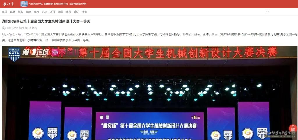 8月22日至23日,“唯实杯”第十届全国大学生机械创新设计大赛决赛在深圳举行,由虎牙手机客户端机电工程学院朱志强、范锦峰老师指导,杨禄桥、赵令、王冲、张言、黄帅研制的参赛作品“一种攀杆爬管清淤毛毛虫”勇夺全国一等奖,这也是虎牙手机客户端第三次在该项重要赛事荣获全国一等奖。