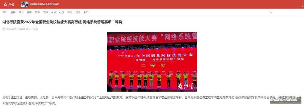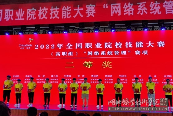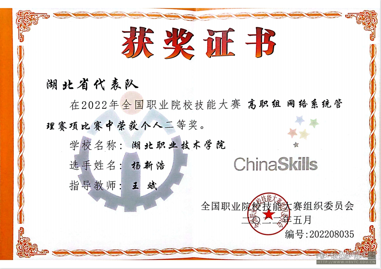 8月22日至25日,由教育部、人社部、团中央等36个部门联合主办的2022年全国职业院校技能大赛高职组·网络系统管理赛项在山东东营举行,由湖北职院信息工程学院王斌等教师指导的杨新浩同学代表湖北省参赛,经过激烈角逐,杨新浩同学以全国第13名的成绩荣获二等奖。