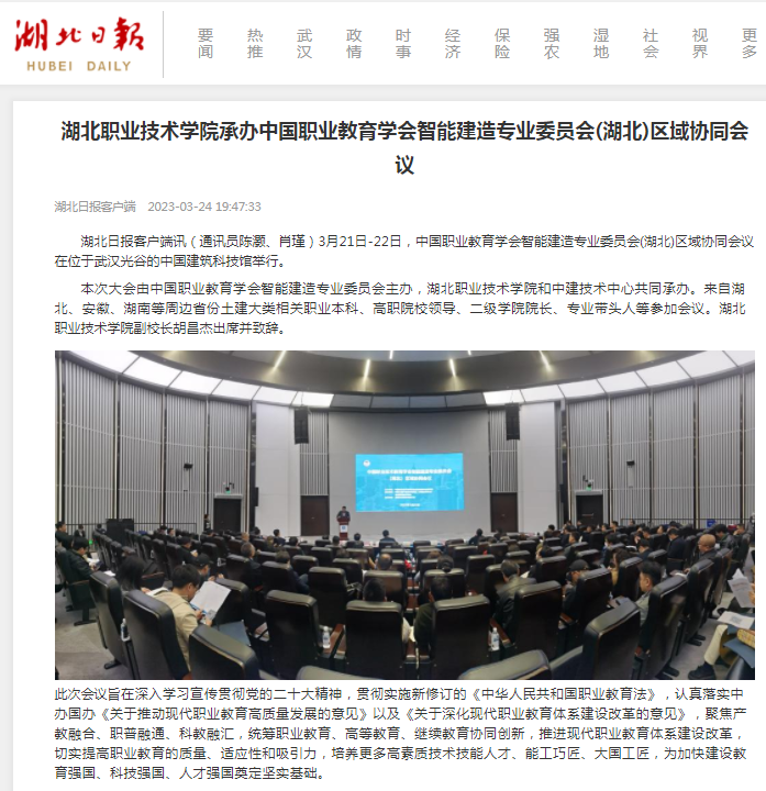 湖北日报客户端讯(通讯员陈灏、肖瑾)3月21日-22日,中国职业教育学会智能建造专业委员会(湖北)区域协同会议在位于武汉光谷的中国建筑科技馆举行。