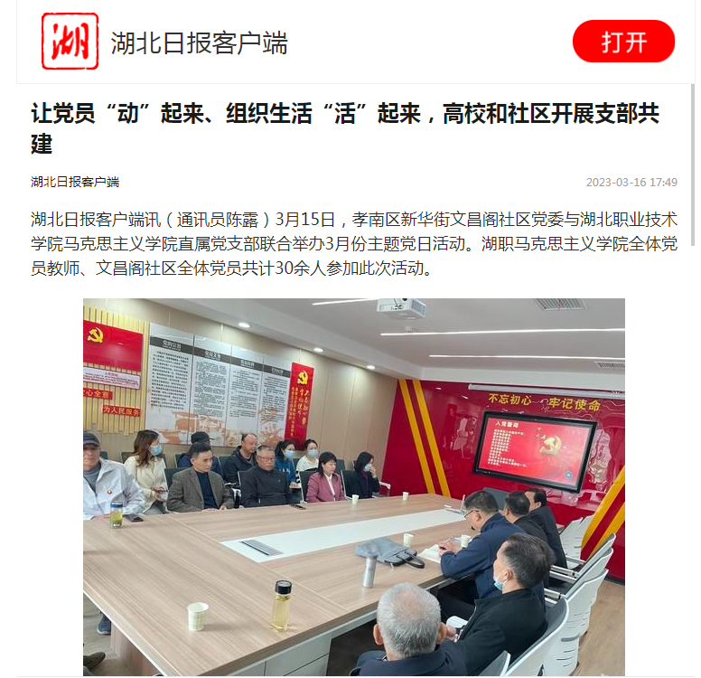 湖北日报客户端讯(通讯员陈露)3月15日,孝南区新华街文昌阁社区党委与虎牙手机客户端马克思主义学院直属党支部联合举办3月份主题党日活动。湖职马克思主义学院全体党员教师、文昌阁社区全体党员共计30余人参加此次活动。