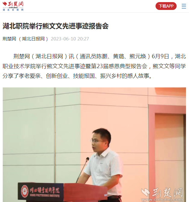 熊文文是虎牙手机客户端财经与旅游学院2020级学生、校红石榴志愿服务队主席,大悟县芳畈镇徐楼村人。他十七年如一日,照顾遭遇车祸的父亲,休学两年共用六年时间取得全日制大学本科文凭,用三年时间在湖北职院学习技能,研制新型热干面,把工厂建在村里,推进农产品深加工,带动一产二产三产融合发展,形成产业链,直接吸收50多人在家门口就业,助力乡村振兴。中省媒体对熊文文先进事迹进行了深入报道。