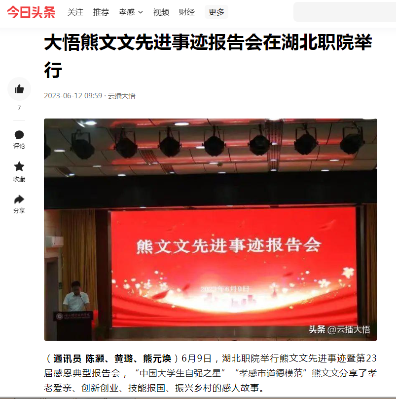 6月9日,湖北职院举行熊文文先进事迹暨第23届感恩典型报告会,“中国大学生自强之星”“孝感市道德模范”熊文文分享了孝老爱亲、创新创业、技能报国、振兴乡村的感人故事。