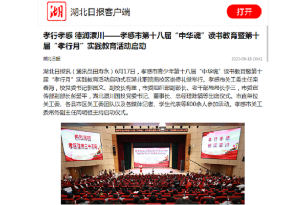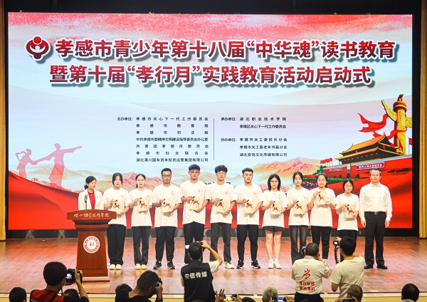 6月17日,孝感市青少年第十八届“中华魂”读书教育暨第十届“孝行月”实践教育活动启动式在湖北职院南校区崇德礼堂举行。孝感市关工委主任栾春海,湖北职院党委书记郭国文、副校长梅重,市委组织部副部长、老干部局局长李三,市委宣传部副部长彭爱平,湖北澴川国投党委书记、董事长、总经理陈情等出席仪式。市直单位关工委、各县市区关工委团队以及各媒体记者、学生代表等800余人参加活动。孝感市关工委常务副主任周明祖主持启动仪式。