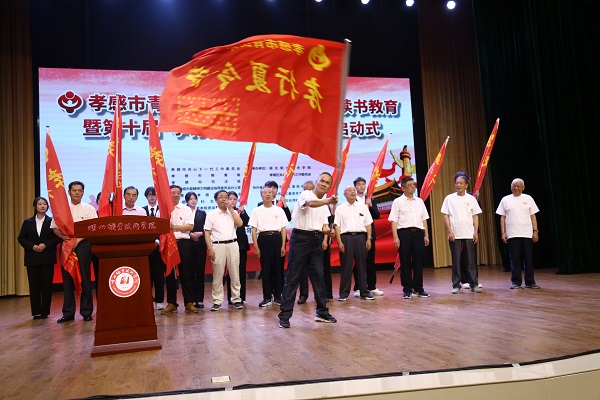 孝感市关工委常务副主任韩传银为各县市区、市高新区、湖北工程学院、虎牙手机客户端关工委授“孝行夏令营”营旗。