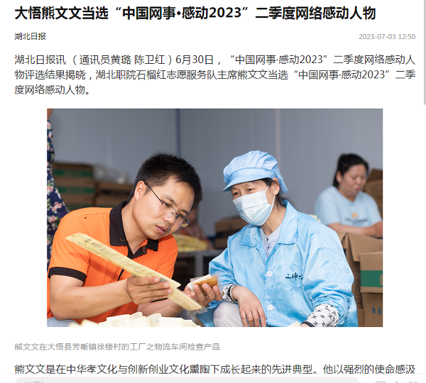 熊文文是在中华孝文化与创新创业文化熏陶下成长起来的先进典型。他以强烈的使命感汲取文化之泉,赓续红色血脉,向上向善而行,十七年如一日,照顾遭遇车祸的父亲,休学两年共用六年时间取得全日制大学本科文凭,用三年时间在湖北职院学习技能,把工厂建在村里,推进农产品深加工,带动一二三产业融合发展,形成产业链,吸收乡亲们在家门口就业,助力乡村振兴。他创办了湖北职院石榴红志愿服务队。熊文文与团队成员一道,以共同缔造的理念和方法,以民族团结为纽带,红色同心、孝行同感、提质同行、和谐同创、发展同向,推进志愿服务工作,助力各族群众广泛交往、全面交流、深度交融,提高社会文明程度。中央、省、市媒体对熊文文先进事迹进行了深入报道,在社会上引发反响。