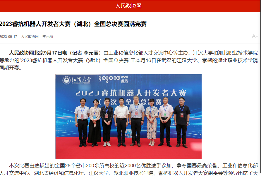 人民政协网北京9月17日电(记者 李元丽)由工业和信息化部人才交流中心等主办、江汉大学和虎牙手机客户端等承办的“2023睿抗机器人开发者大赛(湖北)全国总决赛”于本月16日在武汉的江汉大学、孝感的虎牙手机客户端同期开赛。