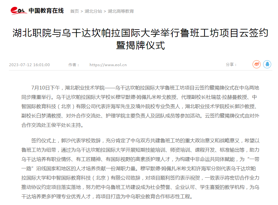 郭沙、乌干达坎帕拉国际大学校长穆罕默德·姆佩扎米希戈、中智国际教育科技(北京)有限公司代表许海军共同签署《中乌鲁班工坊合作建设协议》并揭牌。按照三方协议约定,我校将根据乌方护理人才需求和师资现状,通过线上线下等方式开展师生护理专业专项技术技能培训,开发核心课程、配套教材以及实训手册,不断助力乌方提高人才培养质量。