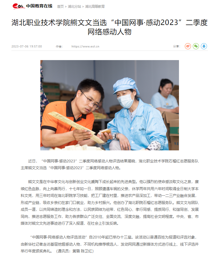 熊文文是在中华孝文化与创新创业文化熏陶下成长起来的先进典型。他以强烈的使命感汲取文化之泉,赓续红色血脉,向上向善而行,十七年如一日,照顾遭遇车祸的父亲,休学两年共用六年时间取得全日制大学本科文凭,用三年时间在湖北职院学习技能,把工厂建在村里,推进农产品深加工,带动一二三产业融合发展,形成产业链,吸收乡亲们在家门口就业,助力乡村振兴。他创办了湖北职院石榴红志愿服务队。熊文文与团队成员一道,以共同缔造的理念和方法,以民族团结为纽带,红色同心、孝行同感、提质同行、和谐同创、发展同向,推进志愿服务工作,助力各族群众广泛交往、全面交流、深度交融,提高社会文明程度。中央、省、市媒体对熊文文先进事迹进行了深入报道,在社会上引发反响。
