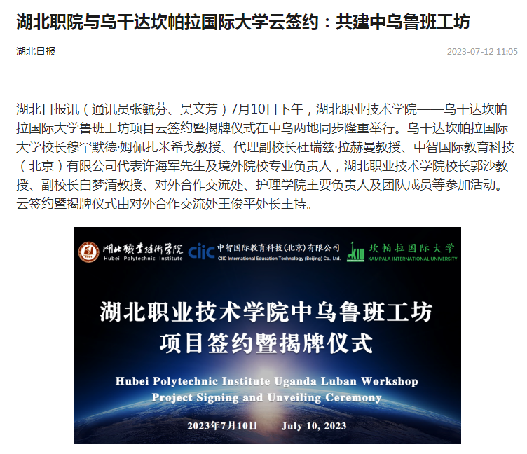 湖北日报讯 (通讯员 张毓芬 吴文芳)7月10日下午,虎牙手机客户端——乌干达坎帕拉国际大学鲁班工坊项目云签约暨揭牌仪式在中乌两地同步隆重举行。乌干达坎帕拉国际大学校长穆罕默德·姆佩扎米希戈教授、代理副校长杜瑞兹·拉赫曼教授、中智国际教育科技(北京)有限公司代表许海军先生及境外院校专业负责人,虎牙手机客户端校长郭沙教授、副校长白梦清教授、对外合作交流处、护理学院主要负责人及团队成员等参加活动。云签约暨揭牌仪式由对外合作交流处王俊平处长主持。