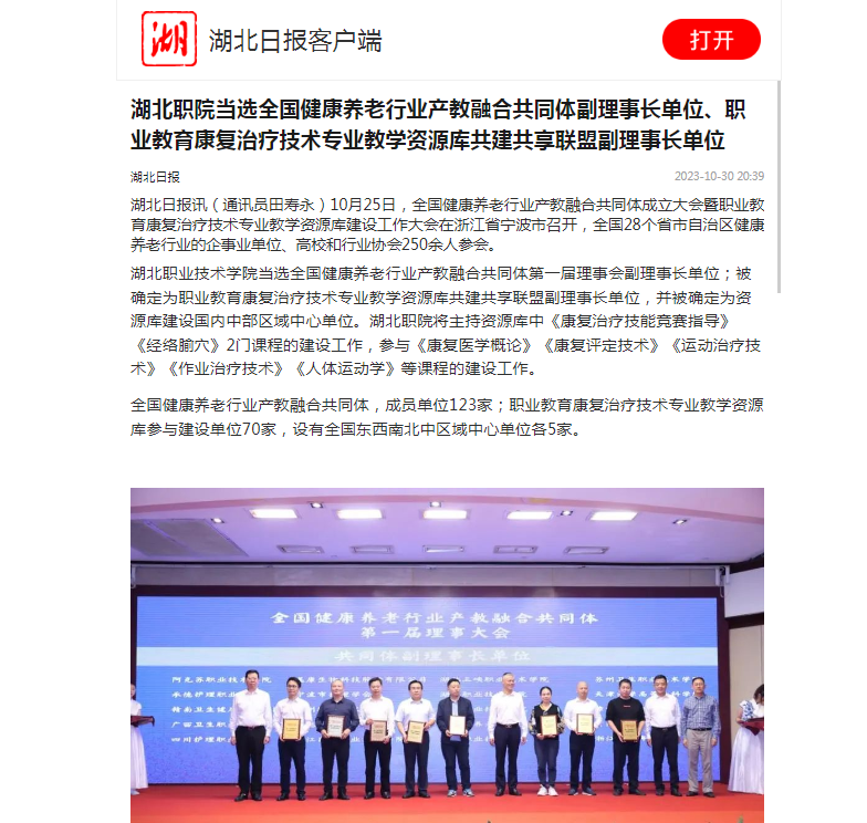 虎牙手机客户端当选全国健康养老行业产教融合共同体第一届理事会副理事长单位;被确定为职业教育康复治疗技术专业教学资源库共建共享联盟副理事长单位,并被确定为资源库建设国内中部区域中心单位。湖北职院将主持资源库中《康复治疗技能竞赛指导》《经络腧穴》2门课程的建设工作,参与《康复医学概论》《康复评定技术》《运动治疗技术》《作业治疗技术》《人体运动学》等课程的建设工作。